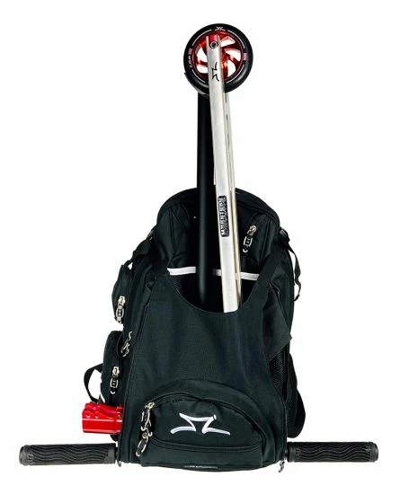 The AO backpack Transit is the perfect companion for school and scootering. Many smart features, such as compartments for laptop, mouse, sunglasses and water bottles, padded back and shoulder straps and details such as 10 mm zippers and a waterproof bottom truly make your daily life easier and more comfortable. One of the most popular features is an open pocket in the front for shoes or dirty or wet items. By simply opening 2 zippers this pocket converts into a scooter carrying compartment for your deck, bar or even complete scooter.