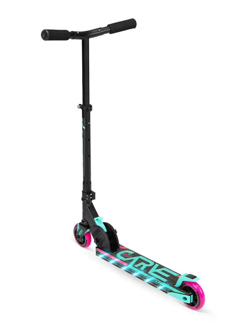 The Madd Gear Carve Flight Light-Up Alloy Folding Kick Scooter with Adjustable Handlebar is ideal for riders 3 years and up! Featuring a multi-function LED light-up deck which will illuminate your ride!